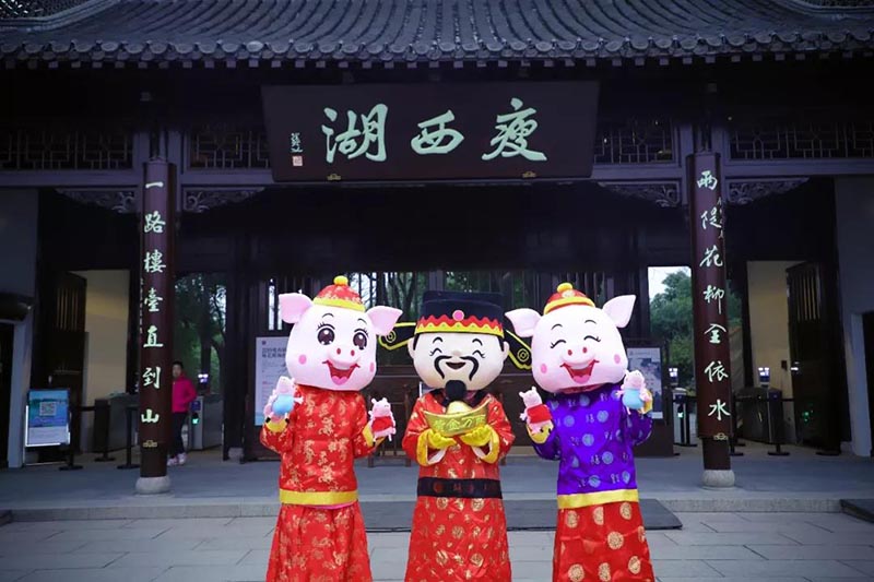 身著“吉祥如意豬”卡通人偶服的工作人員在景區(qū)入口給小朋友們拜年,送上景區(qū)第一聲誠摯的祝福,贈送小豬佩奇玩偶,活躍氣氛。